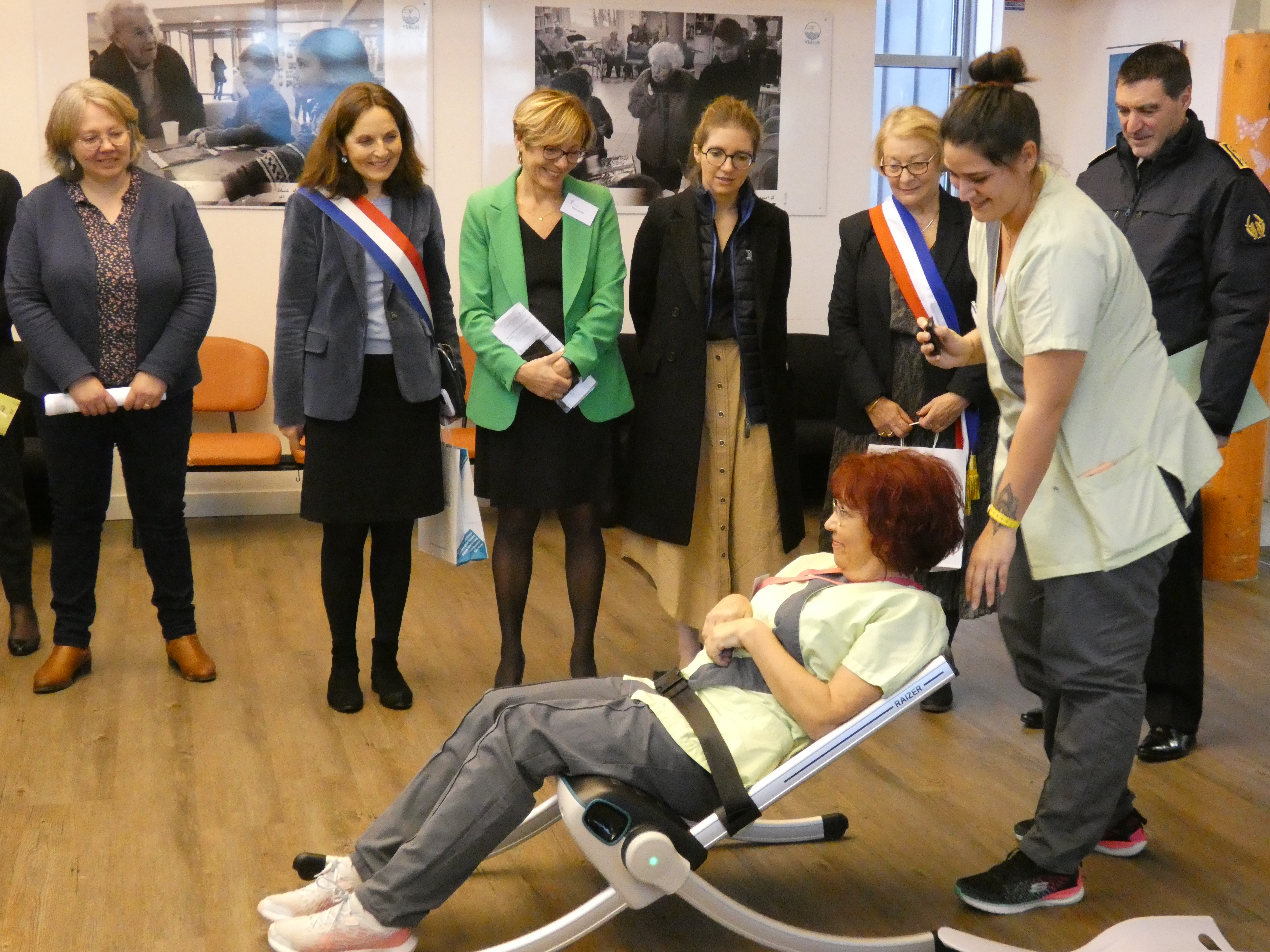 Les professionnels de l’établissement ont également présenté la salle de bain bien-être avant de proposer une démonstration de l’innovante chaise de relevage, permettant d’assister immédiatement un résident en cas de chute, sans effort physique ni inconfort pour la personne aidée.